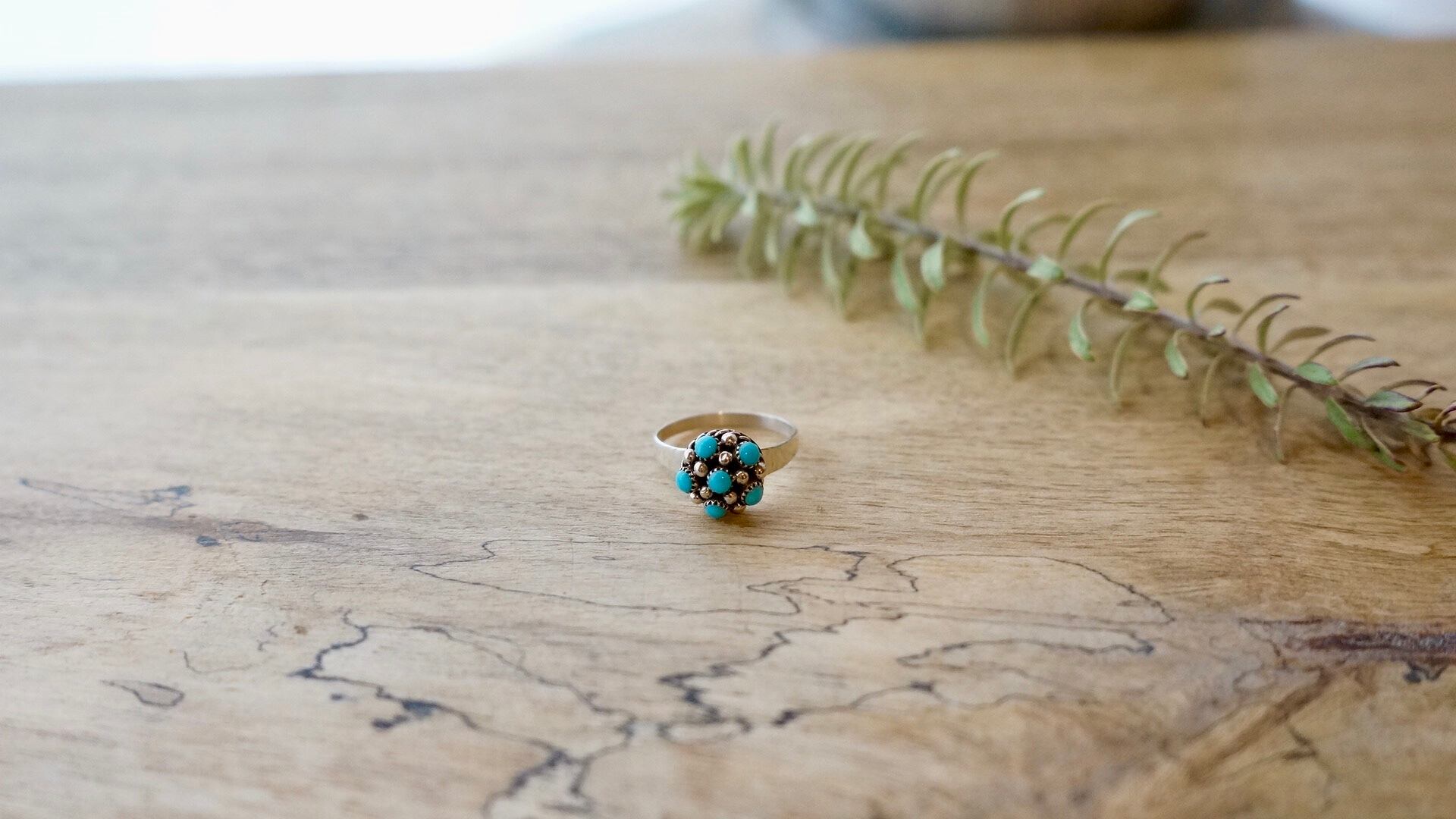 ドーム型の様な丸っこいデザインと、ターコイズのプチポイントが特徴のリングです。