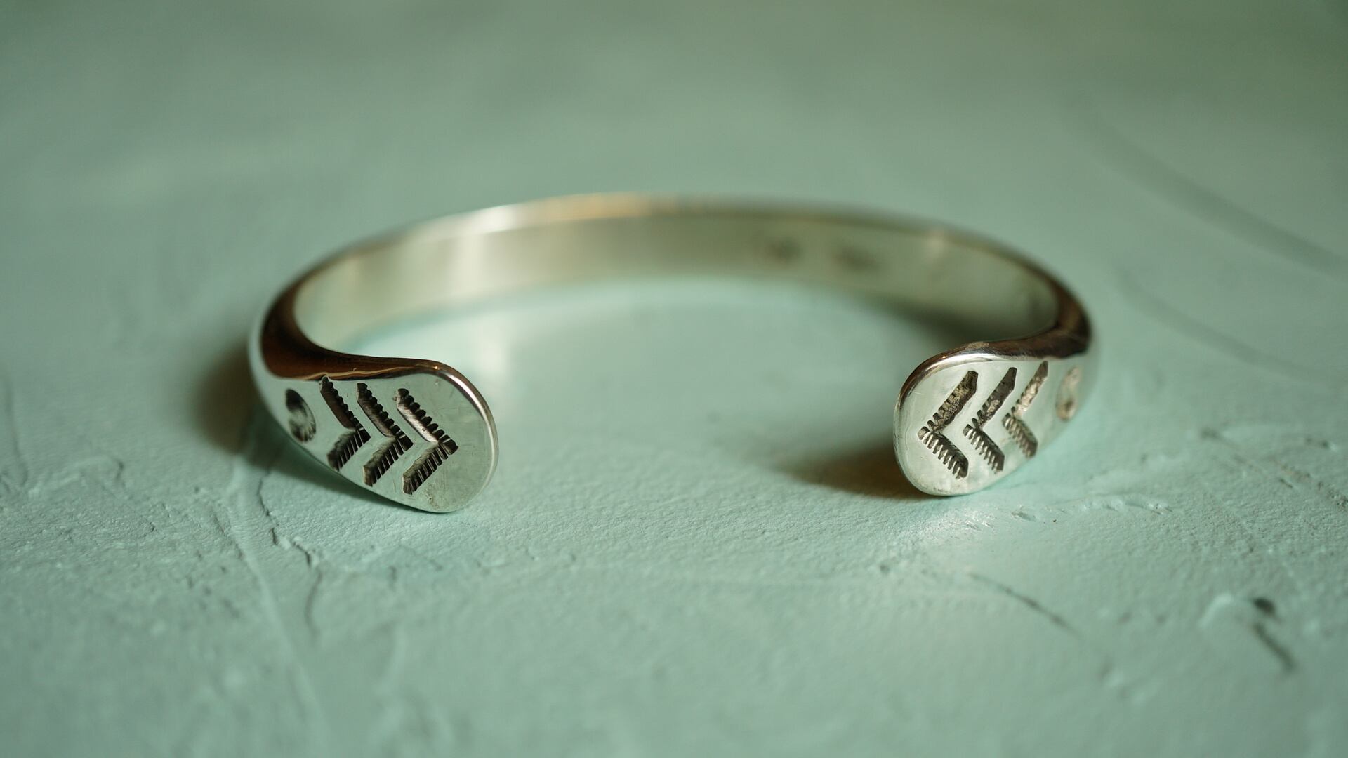 プレーンなスタイルのバングルの淵に力強く打たれたスタンプワーク、それに耐えうるシルバーの厚さ。