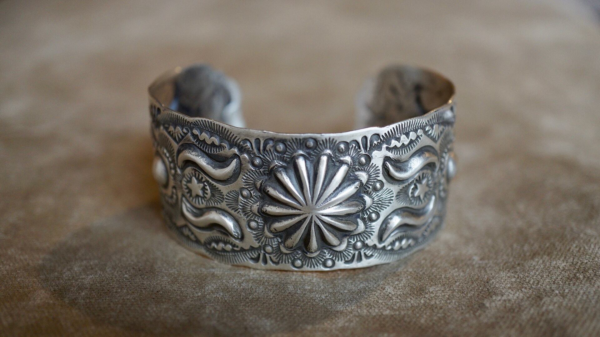 ナバホ族にとって強い力と癒しの象徴であるサンバーストをメインに大小様々なスタンプワークが打たれています。存在感があり、男女ともにおすすめです。