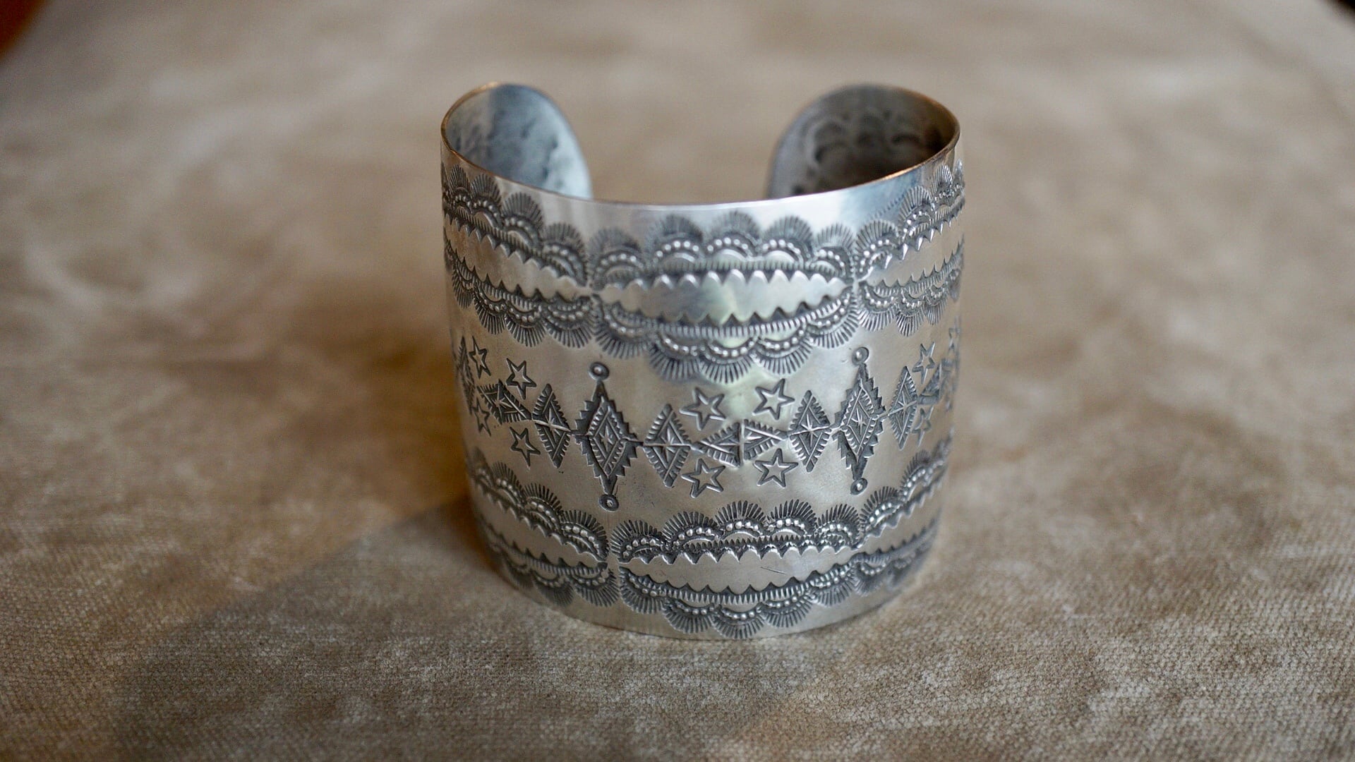ナバホラグの様に華やかなスタンプワークと大きいサイズのバングルがヴィンセントらしい仕上がりになっています。
