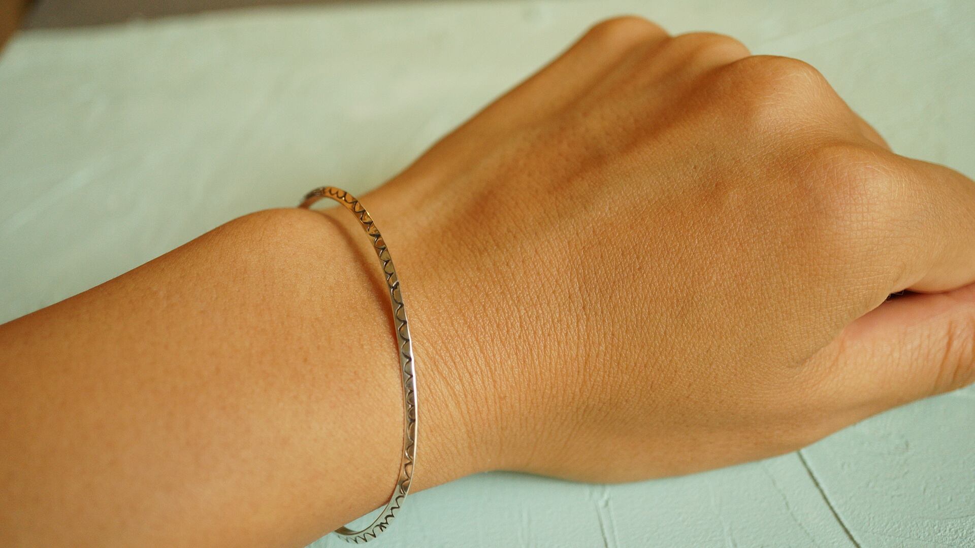 この細さは中々出会えないので普段バングルをつけ慣れない方でも気軽に楽しめますし、綺麗なシルエットがオシャレを演出してくれます。
