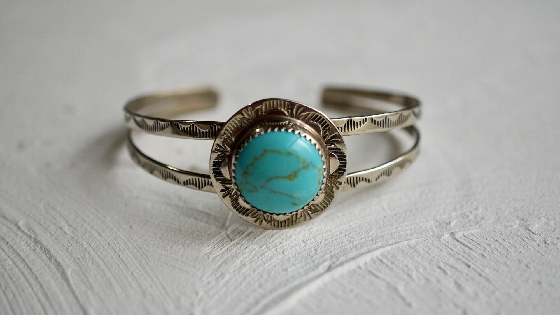 センターに大きなボール型のターコイズがはめ込まれ、手首部分にはフェンスのスタンプが打たれたオールドスタイルの雰囲気のバングルです。