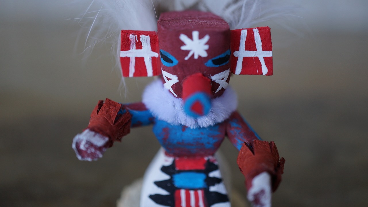 こちらはBig fore headのカチーナです。ホッペに砂時計のペイント、前頭が大きく英知の象徴と言われています。